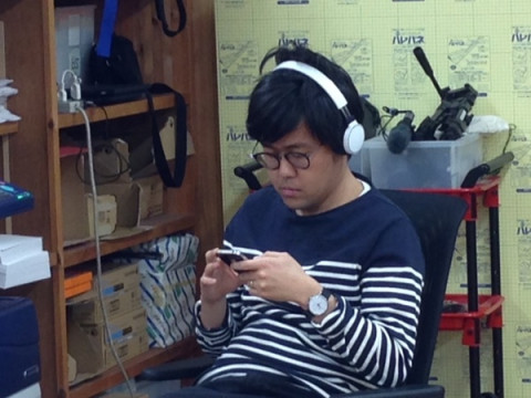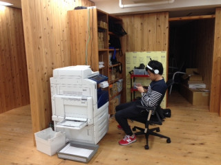 コピー機の前で、イスに座り足を組み、iPhoneをいじり、ヘッドホン。