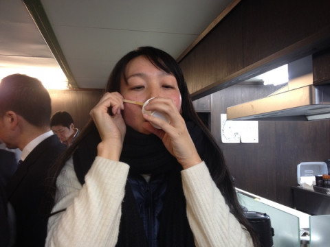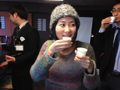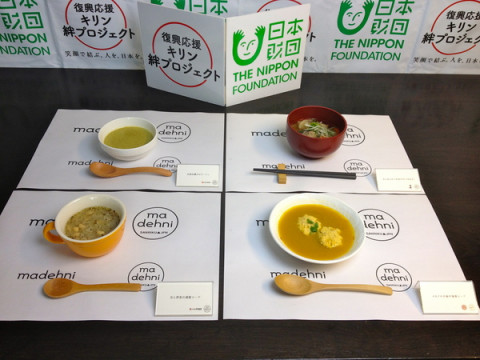 スープ試食! さぁ、待っていました、スープの試食です! 「さんまとかつお出汁のつみれ汁」 「豆と押麦の満腹スープ」 「メカジキの地中海スープ」 「完熟牡蠣のポタージュ」 の4種類を試食しました。 オノデラコーポレーションの紀子さんがスープをついでくれました。 もう、その満面の笑顔だけでおなかいっぱいになりそうです。 われわれ、お昼ご飯を食べた後でしたが、4種類、きっちりいただきました! スープを「飲む」というよりは、じっくりと味わって 「食べる」という感覚。 外ではパラパラと雪が降っていたので、冷えたからだがぽっかぽかになりました。 まだ開発段階ということだったので、どんな仕上がりになるのか、今からたのしみです。 「までーに」シリーズの情報は、 こちらのページに順次アップされていく予定です。 ぜひ、チェックしてみてくださいね。 2014/03/10 16:32 |