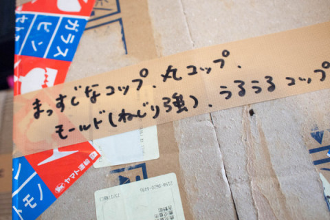 あすから開催です! ただいま連載中の 「コップ屋の高橋禎彦さん。」、あす13日(木)からの展覧会開催にむけ、きょうは搬入作業ということでちょこっとお邪魔してきました。 *展覧会情報は こちらのページからどうぞ。 今回、高橋さん自らの企画ということで、展示台からなにから、ご自身でつくっておられます。 もちろんコップの製作も無事終了、たくさんのダンボールが並んでいました。 「ワインのコップ」らしき箱もありましたよー! どうやら木金あたりは雨模様らしい東京ですが、18日まで開催しておりますので、どうぞお出かけくださいねー。 2014/03/12 17:26 |