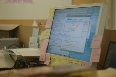 PCのディスプレイのまわりに仕事のto do項目を貼りつけるのが、ベイちゃんの仕事超整理術。