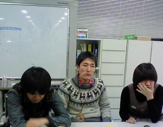 ハリー・おっくん・ゆーないとの3人が静かに何かを耐えています。