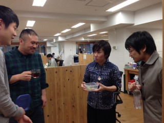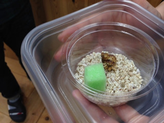 ちゃんが、タッパーのなかにいる、何かを持っています。