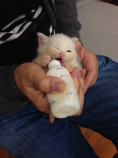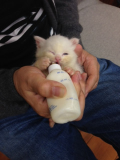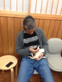 哺乳社長 今日の「今日のダーリン」にも書かれていますが、昨晩は遅くから、ねこが大大大好きなあのお方と、ミグノンの友森さんと社長の鼎談がありました。 例によって、友森さんは哺乳中のこねこを三匹連れで、着くやいなや、まず哺乳。 社長、人生初の哺乳を体験の巻。 すっかり慣れて 「よっ、哺乳上手!」 などと言われていました。 顔の筋肉もすっかりゆるみ、父性というか、母性のかたまりみたいになっておりました。 しかしこねこたち、まー、よく飲むこと! 毎日このミルクで育っているのですなー。 もうちょっとしたら、離乳食かな? ミグノンプランに関わるコンテンツです。 どうぞおたのしみにー! 2014/04/04 14:07 |