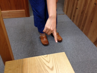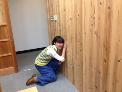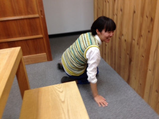 と座ろうとした山川みちこがイスのかどに弁慶の泣きどころを!