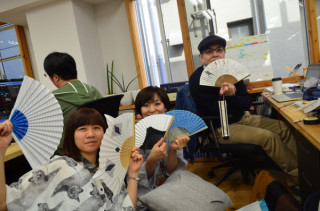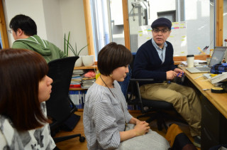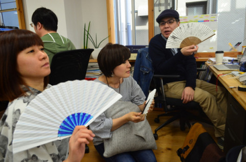 狭いスペース会議。 お隣の奥まった席にいる こんなスペースで会議をしています。 ああ、失礼しますよ、ちょっと失礼して座らして頂いてと。 あれ? 結構深刻じゃん? とおもったら、本日アップの「扇子」のページの最終的な確認というたいへん真面目なやつでした。 そりゃ、真面目な顔になるわな。 ねえねえ、みしてみしてー。 今年の新作みしてー。 にゃ〜ん! かわいいー! 超かわいいじゃーん! 今日のページには詳細はまだ出てませんが、とにかくかわいいということをお伝えしておきます。 予告がどんどん続きますが、おたのしみにねー! あ、販売は4/23ですよん。 2014/04/16 16:18 |