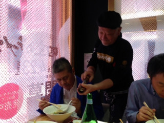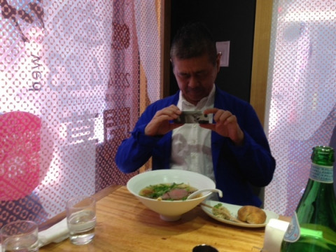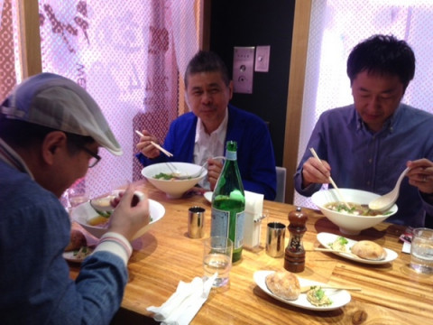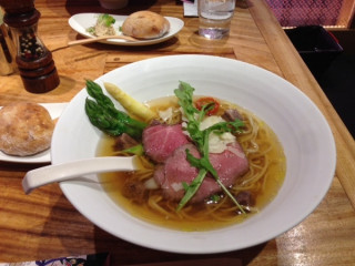 コンソメのラーメン きました!パンとリエット、そして、すきとおったコンソメスープのラーメンです。 きゃー! きれいすぎて、写真撮っちゃう。 そして、もちのろん、おいしーーー! みんな、スープもぜんぶ、ペロリでした。 「四季のラーメン」シリーズの春。 〜黄金に煌めく超絶コンソメヌードル〜 牛のローストビーフ、アスパラ、スナップエンドウ、菜の花、水菜。ちいさいトマトも入ってました。 チーズも入ってたしー。 途中、河原社長自らコショウをひいてくださいました。 こりゃ、ラーメンというか、もう、フランス料理? でも、ラーメン。 おいしかったです!!! 今日だけのメニューなので、よろしければーー! 2014/04/23 14:34 |