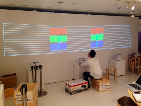 三台の単焦点プロジェクターを同期させてひとつの大きな横長の映像を動かす