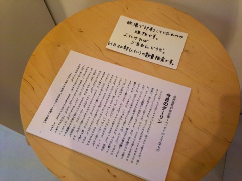 加藤さんの活版 今回も「はたらく道具」のコーナーには創業47年、たったひとりでいまも活版印刷の新聞を発行し続けている秋田・上小阿仁新聞社の加藤隆男さんの 「活字」を展示しています。 まさしく、その展示されている活字で刷った印刷物があるていど残っていたので、会場内で配布することにいたしました。 加藤さんの印刷風景の動画も活字の隣の壁に投影しているのですがその動画の中で一枚一枚、刷られているものの現物です。 あたりまえですが、これ、「コピー」じゃないんですよね。 一枚一枚、加藤さんが、手で印刷機に紙を送って印刷したものです。 数に限りがあるので、展覧会の全日数で割り算をしまして一日20部(くらい)を置いておきます。 よろしければ、ぜひどうぞ。 写真のように、色も何種類かありますよ。 2014/04/25 20:18 |