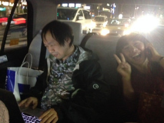 タクシー移動の時間をおしみ、祖父江さんはパソコンで資料づくり、スガノさんは打ち合わせの電話をしています。