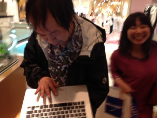 タクシーをおりてもパソコンで作業を続ける祖父江さん。