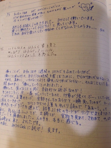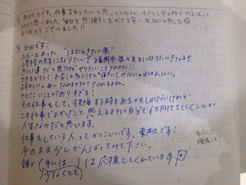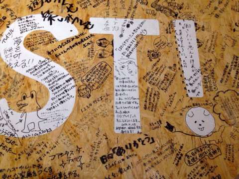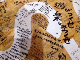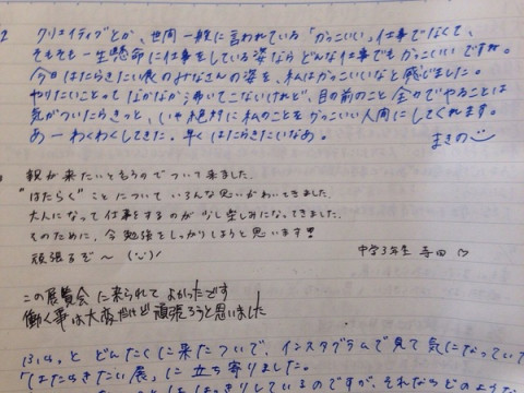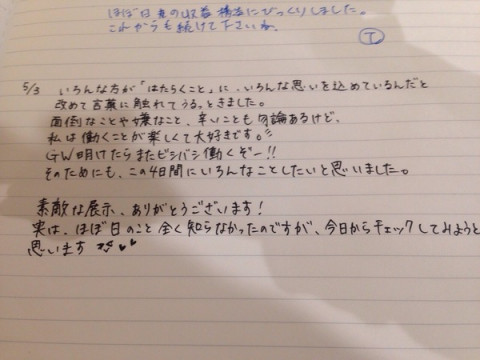 FUKUOKAのテーブル 福岡パルコ8階パルコファクトリーで開催中の 「はたらきたい展。FUKUOKA」は会期そろそろ後半戦なんですが、会場のテーブルはもう、このとおりけっこうギッシリのようです。 (パルコのスタッフのかたに 写真を撮って送っていただきました) 渋谷・大阪のときのテーブルも会場の外壁に 「会場外展示」としてディスプレイしてますが地域によって書き方になんとなーくの特色があるっぽいのがおもしろいです。 (たとえば、大阪展のときのテーブルには みなさん「空白」を埋めるように スキマスキマを狙って書き込んでいたり) また、感想ノートのほうにもたくさん書き込んでいただいているみたいです。 「元気になった、やる気が出た」って感想もやっぱり多いのですが 「はたらくってなんなのか、 展示を見てもまだちょっとわからないけど たぶん来てよかったんだと思う」 みたいな、けっこう素直な感想もあります。 で、そういう感想を残していける雰囲気が 「はたらきたい展」のいいところなのかなって思います。 会場に来てくださっているみなさんがそういう雰囲気をふくめ、会場をつくってくれているんですよねー。 福岡の人たちの間では有名な小学生画伯・モンドくんが来る5日(月)にぼくもまた会場に行くのでみなさんの感想を読めるのが、すごく楽しみ。 会期は5月11日(日)までです。 経験上、終わりに近づくほど混雑してきます。 福岡のみなさん、九州近辺のみなさん、ぜひ遊びに来てくださいね。 そして、何でもいいのであの場所で感じたことや考えたことをノートやテーブルに残していってもらえるとうれしいです! 2014/05/04 01:21 |