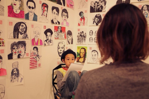 福岡ではたいへん有名な小学5年のちっちゃい画伯モンドくんが会場の一角で出張似顔絵屋さんを開いているのでそのようすなども上の「はたらきたい展。」のページでテキスト中継しています。
