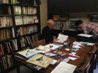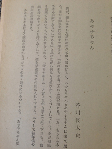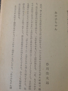ひきつづき谷川俊太郎さん ベイちゃんと、谷川俊太郎さん宅におります。 この数日、私は、俊太郎さんの過去の詩をあるテーマで読み返す仕事をしておりました。 その仕事の話をしていると、俊太郎さんは 「ぼくの文が最初に印刷された本、見る?」 とおっしゃってある本を出してくださいました。 『熊の子と薔薇』? 昭和17年6月発行。 ‥‥‥‥ということは、谷川俊太郎さん11歳のときの文章。 幼くしてなくなった 「あや子ちゃん」に寄せた文章だそうです。 11歳の文とは思えぬ完成度。 そして、その本が取ってあるのもすごいです。 2014/05/07 16:26 |