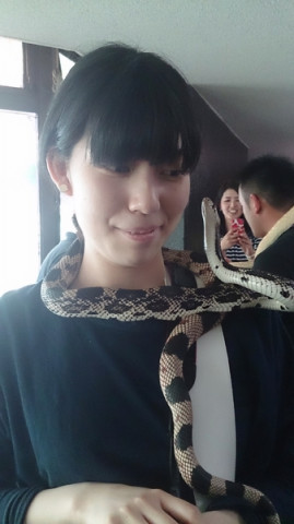 ふれあいコーナーにて、タカモリさんとももちゃん、ヘビを巻きました。