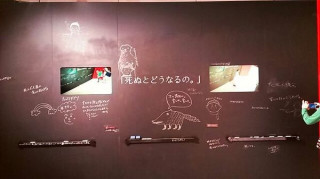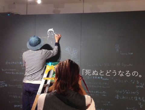 「死ぬとどうなるの。」 かないくん展で 「たっぷり死んで」(そぶちゃん談) たどりついた先には 感想ノートやみんなが書ける 「死ぬとどうなるの。」の黒板があります。 思い思いの言葉をチョークでしたためてくださっている様子をうれしく拝見していたのですが、だんだん、書くスペースがなくなってきました。 そこで! 昨晩、黒板の第一弾をカメラマンさんにお願いして、しっかり撮影し、その画像を出力して貼り付けられるようにただいま準備をしています。 今日からは松本大洋さんが描いてくださったかないくんを残し、黒板はスッキリときれいになっています。 自分なりの 「死ぬとどうなるの。」 よかったらのこしていってくださいね。 2014/05/22 19:04 |