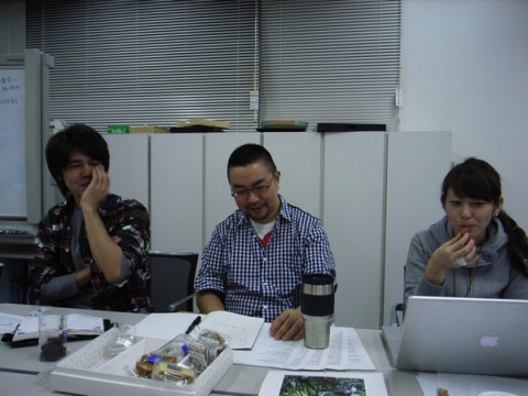 明日の取材を前に、全員で事前の打ち合わせ中。