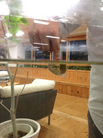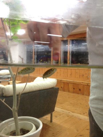 今日もフグ係は。 ほぼにちは。 フグ水槽そばの自席で作業をしていると、にわかに背後がにぎやかになるタイミングがあります。 (だいたい18〜19時頃。) たいていはフグのご飯の時間か、フグ係が水槽を囲んでミーティングのどちらか。 わたしはその様子を写真におさめるのがくせのようになっています。 この日は 最近のフグニュースとしては、水槽に水草を植えたこと! 画面に入ってくる緑に、さわやかさが増しました。 水草がうれしいのかフグはいつにも増してご機嫌に泳いでおります。 「今日もフグは」のページ、実はちょこちょこ更新されているので、よかったら覗いてみてくださいね。 ちなみに、フグと1番仲良しの(?) 最近はフグとダイレクトに触れ合うというひそかな楽しみを見つけたようです。 イルカセラピーならぬ、フグセラピー? 2014/06/05 13:53 |
