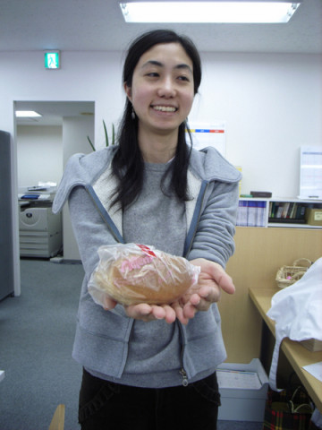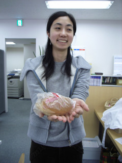 ちゃんが、コロッケパンを持って社内をうろうろしています。