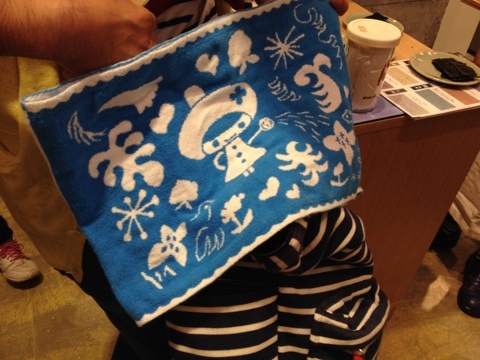 扇子にくまおに、ハラマキ! 海苔の試食をしていたこちらの男性が、 「ほぼ日の扇子」の扇子の 「にゃんす」を! この扇子はほぼ日ストアでは完売しているので、いわば幻の扇子。 とてもお似合いですー。 リュックには「くまお」も! うわー! タグも大切に、つけたままに!! うれしいなぁ。 リュックの中からは、荒井良二さんのハラマキが出てきました。 いつも持ち歩いてくださっているんだそうです。 夏場は、冷房でけっこう冷えるんですよねー。 いろいろ見せていただき、ありがとうございました! 2014/07/19 13:42 |
