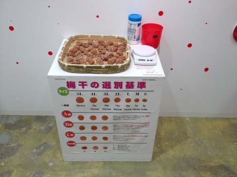 烏梅 「にっぽんの梅干し展」には、きっとみなさんが思っている以上に読み物が充実しています。 コンテンツの多さに、びっくりです。 展示のはじめは、やっぱり歴史から。 へー、梅干しって中国から渡来したものなんですね。 中国では「烏梅」と書き、 「ウーメー」と呼ばれていたそうです。 製造の過程の読み物のところには、手作業で行われているという梅干しの大きさの選別が体験できるので、やってみました。 重さによって、Sから5Lまでの7段階があるそうです。 これは…けっこうずっしりくるから、一番大きな5L! 測ってみると、26g。 正解は4Lでした。 これは難しい!! これを手作業でやっているなんて。 当たるまでやり続けようと思いましたが、5回連続失敗だったのであきらめました。 選別をしてる方、ほんとうにすごいなぁ。 2014/07/19 14:19 |