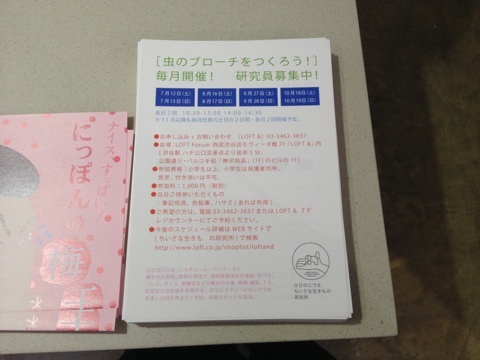おなじみの方のグッズも ほぼ日でおなじみの方々のグッズも、Loft&にありました。 こちらは福田利之さんのコーナー。 (写真1枚目)うわぁ、このカンカン、かわいいーー! 一番小さなカンカンはほぼ日の日本茶入れにピッタリかも。 続いて、ひびのこづえさんのコーナー。 (写真3枚目)ハンカチゾーンが圧巻です。 これは、1枚に絞るのが難しそう…。 虫のブローチをつくるワークショップも月に1回行っているみたいです。 ワークショップ、たのしそうー! 2014/07/19 16:12 |