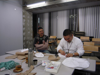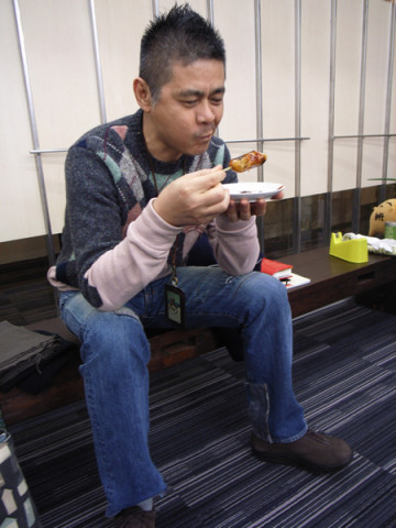 社長シリーズ 本日、弊社の大ホールでは、 「スソさんのたのしい帽子教室」が開催されておりました。 まことに楽しい帽子教室であります。 そして、社長も遊びにやってきます。 社長! 社長! スソさんがだんごを! 「お! あれね! スソさ〜ん、いただきます!」 もぐもぐ。 「うまいね〜。」 そうでゲスね。 なんかこう、だんごだんごしただんギッシュなだんごじゃなくて、もちっぽいところが。 そして、ひとしきりスソさんと帽子の話をして、次の会議に向かいました。 2008/03/06 19:50 |