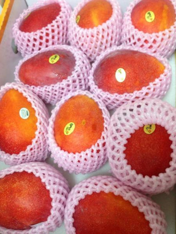 台湾のマンゴー 台湾で「ほぼ日手帳」を扱ってくださっている 誠品書店の劉(リュウ)さんからみずみずしいアップルマンゴーが届きました! 「盛夏のルビー」という名前のついたこのアップルマンゴー、ほんとにルビーのようにつややかで真っ赤! しかもいっぱい! みんながすごい勢いで集まってきてあっという間になくなりました。 (こうやって刺すと安定するそう) さすがの台湾マンゴー、さわやかな酸味と濃厚な甘さのバランスが絶妙で、とっても美味しかったです。 劉さん、ありがとうございました! また日本に遊びに来てくださいね。 2014/07/22 20:46 |