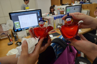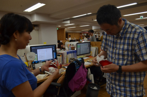 あの儀式。 時間をまきもどすのじゃ! あれは先週の金曜日のことじゃった。 糸井事務所名物のくじ引きによる席替え大会が催されていました。 いや、大会じゃあ、ないんだけどね。 その席替えではたぶんちいさな慣例などがあちこちで行われている可能性があるのですが、その中でも最も有名な儀式は今回ももちろん執り行われていました。 あの、ピエロの交換の儀です。 おもながさんとおでこさんのうち今回はおでこさんが おもながさんが 一部始終を観察していましたが、あんがいあっさりした儀式なのだということが判明いたしました。 2014/08/06 13:57 |