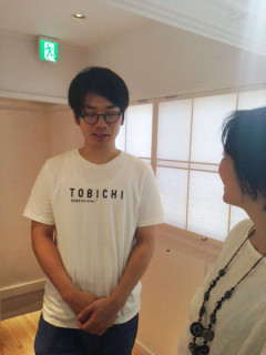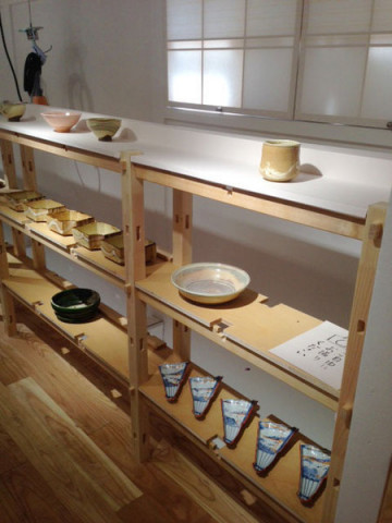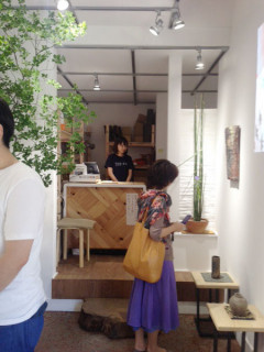 すてきな「TOBICHI」。 先ほど、わたくしも 憧れの、福森さんの器や花器をじーっくりひとつひとつ見て、今日の当番の そのあいだもずーっと、お客さまは途切れず。 盛況で、よかった♪ それにしても、TOBICHI,まだ中も外も、なにも無い時に見たきりだったのですが、カウンターのところの木組みや窓を内側から和紙でおおって、蝶番で開くシステムなど、あちこち見ごたえがありました。 このあと、福森さんが昼食から戻られ、在廊されていました。 器の追加もありそうとのことなので、また行こうと思います。 2014/08/06 17:21 |