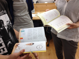 公式ガイドブックできました! 「刷り出しができたよ〜。」の声で人が集まっていたので、近づくと『ほぼ日手帳2015公式ガイドブック』を見ているではないですか! できたてほやほやの完成版でインクの匂いがする〜といいながら熱心に見ています。 カバーの紹介や、手帳本体の解説まで今年も内容盛りだくさん。 こちらのガイドブックは8月26日(火)より販売開始ですので少々お待ちくださいませ。 Amazonでは予約ができますよ〜。 また8月下旬にTOBICHIで開催予定の 手帳のラインナップ展示会にもお目見えする予定です。 手帳2015もガイドブックもお楽しみに! 2014/08/15 18:19 |