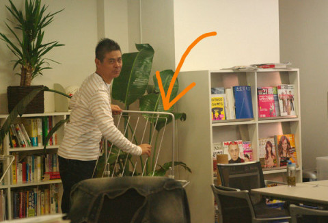 と、思っていたらおもむろにそこに無造作に置いてあった物干しラックを手にし、