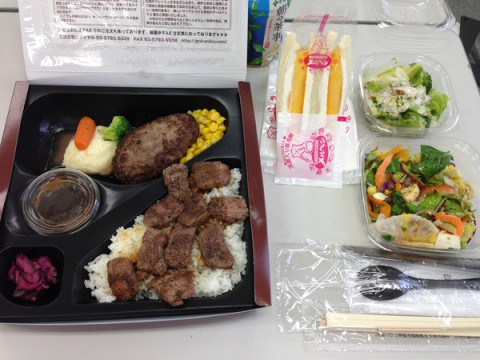 しゃちょーのセレクト もう4時過ぎですが、まだおなかがいっぱいです。 そういえば 「ミート矢澤」のサイコロステーキ&ハンバーグコンボ弁当。 さすがの迫力です。 「肉、ばかりでなく野菜も」 というわけで、右手に見えますのはサラダ類、緑黄色のお惣菜もございます。 その左にかわいく光るパッションカラーは、 「メルヘン」のマンゴーサンドイッチです。 これらを、ほぼ完食した直後の様子が3枚目の写真でございます。 「ふーーーー、食べた食べた。 おなかがいっぱいで、 あったまがぼわーんとする」 と、社長。 「やっぱりおもしろいね、イべんとう。 おおぜいでたのしむ催しとしては かなりいい企画ではないでしょうか。 みんなが買ったのを見ましたけど、 それぞれのらしさが出てるから、 またおもしろい。 いやー、おいしかった。 じゃあね、ごちそうさまでしたー。 あ、山下さんには メルヘンのおてふきを差し上げます。 ふーーー、 こりゃあ午後、眠たくなるわ」 こうして各自が食べ終わることで、今回のイべんとうは自然とフェードアウトしていきました。 みなさまも、よろしかったらじゃんじゃん真似をしてください。 「イべんとう」、たのしいですよぉ。 この催しが、またできますように! さ、夕方からも、がんばろー! 2014/09/10 16:22 |