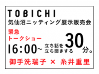 ミニトークショー。 すでにおしらせ済みのことですが、催しの当日ですのでもう一度。 ほんじつ16時からHOBONICHIのTOBICHIで、糸井重里と御手洗瑞子さんのちいさなトークショーがあります。 ==================== 気仙沼ニッティング 展示販売会開催記念トークショー 【立ち話を立ち聞きする30分】 御手洗瑞子 × 糸井重里 日時/ 9月21日(日) 16時〜 場所/HOBONICHIのTOBICHI 入場無料 オールスタンディング ※20名も入れないような会場です。 満員の場合はご入場いただけないこと、 あらかじめご了解ください。 ==================== 気仙沼ニッティング展示販売会についてくわしくはTOBICHIのページをどうぞ。 秋の日の日曜日、どうぞお気軽にお出かけください。 セーターたちと一緒にお待ちしています。 2014/09/21 09:04 |
