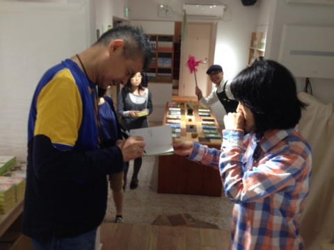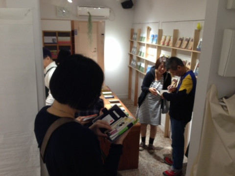 恒例、著者来店! 「小さいことば堂」の売りのひとつは、 「糸井重里が来店した場合、 サインをねだり放題」であること。 今日も、マメな著者は打ち合わせの合間を縫って来店してくださいました。 そして、サインをするのですが、それを撮影しようとすると、あいだに山下が‥‥ああ、もう。 そして著者がサインをはじめるとそれを待っていたかのようにザザッと人の波が。 いらっしゃいませ、いらっしゃいませー。 みなさん、ナイスな勘です。 基本、のんびりムードの本屋さんですが、このように、時々、混みます。 今日も21時までやってます。 ぎりぎりまで、遊びに来てくださいねー。 2014/10/07 19:24 |