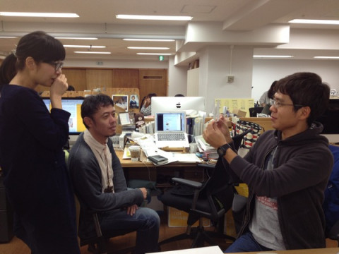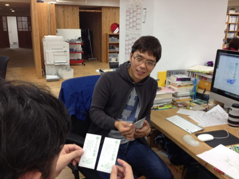 田口のクイズ 「どっちがいいと思います?」と聞いています。 (じーっと見て) 「う、う〜ん。んん?」 (さらにじぃーーっと見て) 「どこが違うの?」 と言うくらい小さな違いです。 「デザインしてるとちょっとした違いが 気になるんすよ。 目が気持ちがいい方がいい、というか。」 と言っていました。 3枚目の写真でお気づきでしょうか。 写真だと違いがわかりやすいかも? でも現物で違うところを見つけるのはむずかしかった! どうやら左が採用されたようです。 目が気持ちいい、と私も思います。 2014/10/16 14:19 |