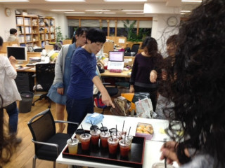 みんなでしょうが&パンまつり 先日、世田谷パン祭りに出店したほぼ日メンバー。 そのときのドリンクメニューを再現して、パン好き が買ってきてくれたパンとともに、ほぼ日のみんなでしょうが&パンまつりをやりましたー! 大量につくったはずのドリンクとパンはいつものようにけっこうな勢いで、みんなのおなかにおさまりました。 ごちそうさまでした! トマトジンジャーはトマトの酸味が、 手かげんしないしょうがシロップのあまさとコクでちょうどよくまろやかになり、あたらしいおいしさが楽しめます! トマトジュース好きにはたまらない一品ですよ〜。 飯島奈美さん考案のレシピも掲載しておりますので、ぜひおためしくださいー! 2014/10/23 14:05 |