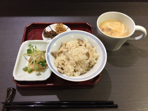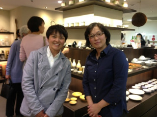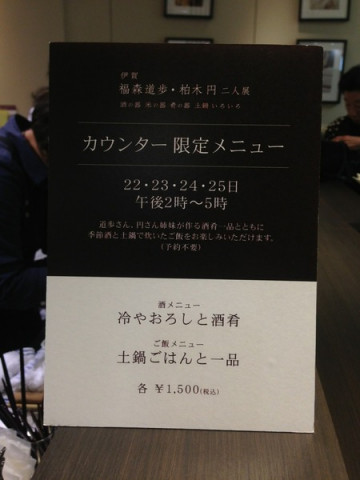 松屋銀座で土楽のごはん 先日、 銀座松屋7階で開催中の、 伊賀・土楽の福森道歩さんと、 柏木円さん姉妹の展覧会。 柏木円さんは「ほぼ日のにほん茶」のマグカップを作ってくださっているので、同じにほん茶チームの お目当ては、カウンターで食べられるというおふたりの料理! ◆酒メニュー:冷やおろしと酒肴 ◆ご飯メニュー:土鍋ご飯と一品 のどちらかを選べます。 お酒メニューもすごく気になったのですが、昼食時だったので、 「ご飯メニュー」を選びました。 まず出てきたのは、具だくさんの粕汁。 それも、円さんがほぼ日のにほん茶用につくってくださったマグカップに入っています。 なんていいアイデア! (ちなみにこちらのマグカップは、 大好評につき1月の再販にむけ準備中です) 粕汁は、ゆずの皮がちょっぴり入っていてものすごくおいしかったです。 土鍋でふっくらと炊かれた天然まいたけの炊き込みごはんも、朝、築地で手に入れたという平目も絶品で、至福のひとときでした。 いい食材を丁寧に料理したものをゆっくり噛みしめながら食べると、なんかすごく元気が出るなぁと思いました。 展覧会は11月4日(火)までですが、おふたりの料理が食べられるのは明日10月25日(土)の14:00〜17:00までですので、お近くに行かれた際は、ぜひのぞいてみてくださいね。 詳しくはこちら。 伊賀 福森道歩・柏木円 二人展 「酒の器 米の器 肴の器 土鍋いろいろ」 2014/10/24 18:35 |