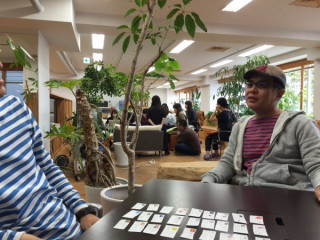 お昼に永田さんと山下さんとシャッフルをしていたら、その向こうに人だかりが。