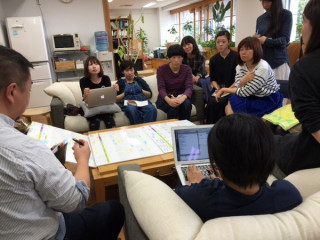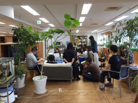 毎週月曜日のお昼は商品を作るいろんなチームが集まって会議をしていますが、こんなに人がいるのになぜか会議室を使わないのが習わしです。