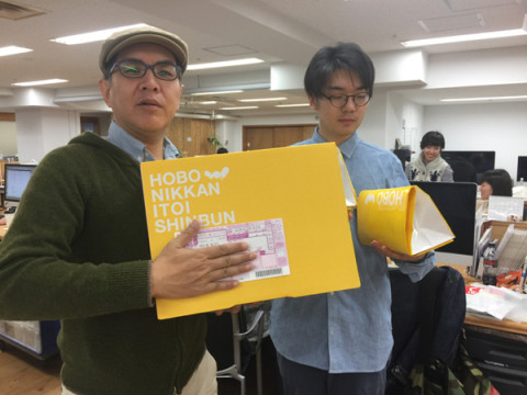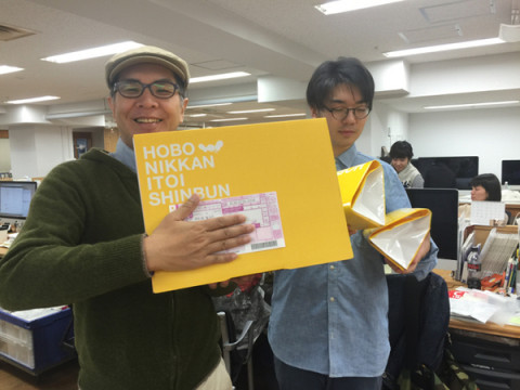 (劇団セルフタイマー) 先日おこなわれました 「劇団セルフタイマー」の鑑賞会。 ご覧になりましたか? 去年に引き続きすばらしい作品が入賞となりました。 本日、グランプリの賞品であるカメラや、佳作の賞品である 「ほぼ日グッズつめあわせ」が出荷されます。 入賞のみなさまいましばらくおまちくださいませ〜。 ところで、宅急便の伝票が写ってはいけないと、山下は華麗に隠してポーズをとるわけですが、アルバイトの駿くんはこういうことにはなれていませんので、ポーズは間に合いませんでした。 「考えてたらでおくれました。」 と。 しかしですよ、おくさん。 これはカメラマンがあとすこしだけ駿君を待てばいいだけなのではないだろうか、と思ったのでした。 まこと、せっかちというものにもこまったものであります。 2014/10/29 15:42 |