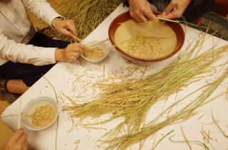 割り箸で穂から外して、へぇ、すり鉢ですって籾殻を外す、と。