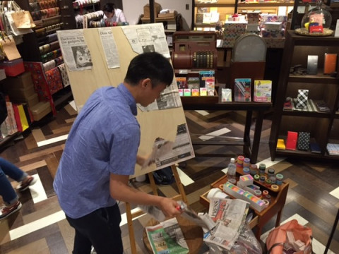 福田さんのライブペインティング こちら、台湾出張組。 まもなく16時(日本時間17時)から誠品書店(台湾)店内につくられたほぼ日手帳ミニショップにて福田利之さんのマスキングテープをつかったライブペインティング(テーピング?)がはじまります。 用意された木板におもむろに古新聞を貼り付けはじめた画伯。 ちょっと貼っては、引いたところから絵のイメージを練られているようすです。 ポツリポツリとギャラリーも集まってきました。 画伯、がんばって! 中継はこちらのFacebookページへどうぞ。 2014/11/04 16:52 |