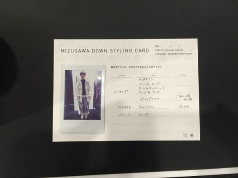 スタイリング相談の手順 轟木さんの 「水沢ダウン スタイリング相談」は以下のような手順ですすみます。 1)轟木さんと相談しながら、お気に入りの着こなしを見つける。 2)スタイリングが決まったら、その写真を撮る。 (必ずしもご着用いただかなくてもかまいません) 3)写真をその場でプリントします。 4)写真を貼って、スタイリング内容をスタイリングカードに記入します。 5)スタイリングカードを差し上げます。 6)裏面の「帰りに寄れるお店」に行くのも、またたのし。 ※ともスさんに、ご協力いただきました。 2014/11/08 19:41 |