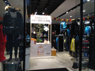 入り口のホットチョコをいただきながら、二階のダウンコーナーで、みなさんと談笑し、地下の屋台で、みなさんと談笑。
