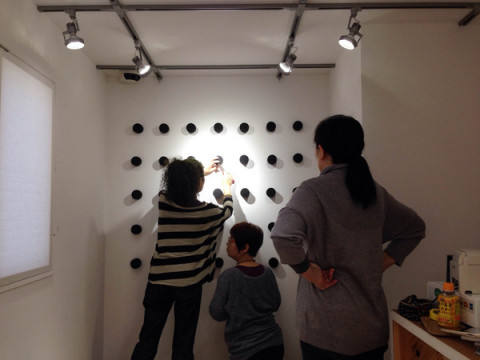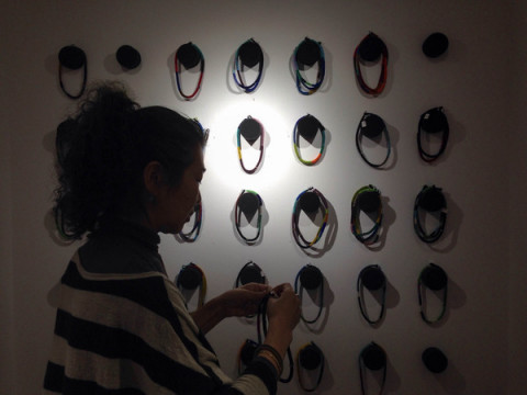 プラハのシノさんによるチョーカーの展示は壁全体がまるでみずたま模様!