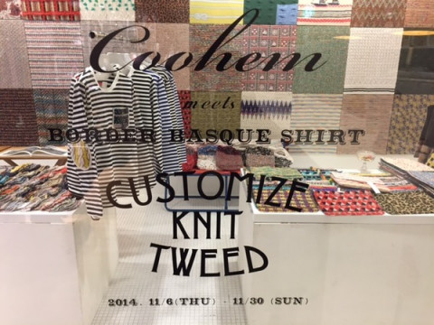 表参道 PASS THE BATON にて ただいま、表参道のPASS THE BATON にて、 ほぼ日手帳のカバーを一緒につくらせていただいたcoohemがすてきなイベントを開催中です。 coohemがこれまでに開発してきた膨大なニットツイードのアーカイブから、すきなものを選んで、バスクシャツの胸ポケットや、エルボパッチ(ひじあて)のカスタマイズオーダーができる 『Coohem meets BORDER BASQUE SHIRT─ CUSTOMIZE KNIT TWEED ─』 というもの。 壁一面に飾られたニットのパネルも圧巻ですが、おなじくニットツイードをつかったクラッチバッグや、トートバッグなど秋の物欲をそそるものばかり。 お近くにいらっしゃることがあればぜひお立ち寄りください。 ーーーーーーーーーーーーーーーーーーーー 『Coohem meets BORDER BASQUE SHIRT─ CUSTOMIZE KNIT TWEED ─』 PASS THE BATON OMOTESANDOにて開催中〜11月30日(日)まで11:00〜21:00(月〜土) 11:00〜20:00(日、祝) ーーーーーーーーーーーーーーーーーーーー 2014/11/14 17:27 |