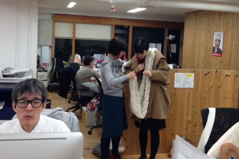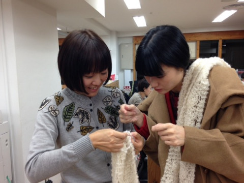 わたくしのおさななじみがmiknitsのマフラーのとじ方がわからないと、三國先生のお弟子のみちこ先生に教わりに来ていました。