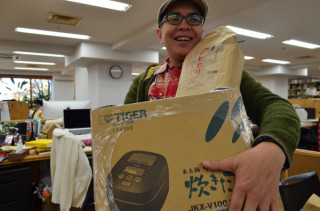 電子ジャー・争奪ゲーム! 山下の腕にあるもの、このうれしい重みを感じるものは何でしょう? お答えしましょう。これらは‥‥ 「タイガー 土鍋圧力IH 炊飯ジャー〈炊きたて〉」です! そして、新潟県上越市から取り寄せた、永田農法のコシヒカリ、5kgです!! このセットがあした、1名様に当たります!! 「どうすれば当たるの?」 良い質問です。 この賞品は、あるゲームに参加するだけで獲得するチャンスが発生します。 「あるゲームって?」 また良い質問だ。 ゲームの名前は、「オンリーでロンリー!」。 くわしいことはリンク先で知ってもらうとして、とにかくただいま、ぜっさんエントリーを受付中です! 締め切りは、あす18日(木)の15時。 でも、「あとで」と思ってると忘れちゃいますよ! チャンスは、いま! ページ内のシンプルなルールを読んで、お気軽にエントリーを! ちなみに、コンテンツでは3kgプレゼントとご案内していますが、なんとうれしい手違い! 5kg頼んでいました。 エントリーはここから! このセットをもらえるのは、あなたかもしれない!!!!! 2014/12/17 14:37 |