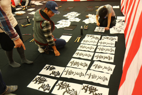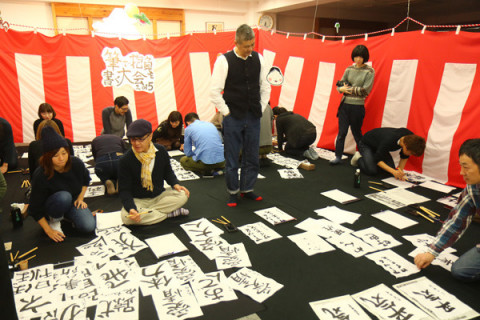 乗組員の書、公開! こんばんは、星野です。 本日1月2日は古来から書き初めを行う日、なのだそうですね。 書き初めといえば 「筆で抱負を書く大会2015」。 本日公開のほぼ日乗組員の書は、12月の中旬のとある日、 「大書道大会」を催して書きました。 “新年のつもり”になってもらうために、会場はお正月ムード満載に。 紅白幕、天井から揺れるおめでたいモチーフ、BGMは春の海、 乗組員を三分割して、各2時間ずつ自由に書いてもらったのですが、一発でさっ!と仕上げるひと、2時間ずーっと同じことばを書き続けるひと、迷って次々にちがうことばを書くひと…ほんとにいろいろで面白かったなあ (わたしは3番目のタイプです)。 そして、集まるかそわそわしながら待っていた読者のみなさまからの投稿、どれもうれしく拝見しています! 墨と筆で書いてくださっている方がけっこう多いことにも感激中。 うう、うれしいなあ。 投稿はまだまだ募集中。 帰省先やお家や旅先で? 「2015年はどんな年にしようかな…」と考えていた方、良かったらご参加くださいね〜! 2015/01/02 20:20 |