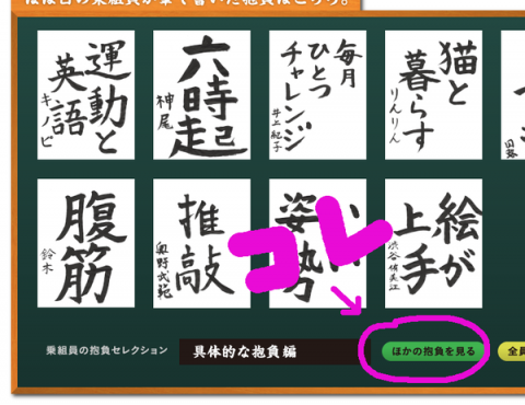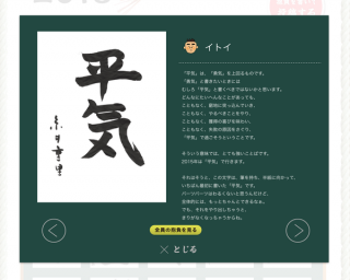 ページのお楽しみ。 こんにちは、 新年から3回連続で 「筆で抱負を…」のことばかり、ごめんなさい! 投稿をいただけるのがうれしくて、ついつい製作中をアップしてしまうのです。 さてさて、今日は気づいている方は気づいているこのページの楽しみ方をご紹介します。 まずひとつめ。 ほぼ日の乗組員が書いた抱負が載っている部分(写真1枚目)の 「他の抱負を見る」というボタンを押すと、画面内の組み合わせが入れ替わります。 「一文字編」というシンプルなものから 「かすれ編」「おもしろ組み合わせ編」などくくりは様々。 ぜひ、ボタンをぽちぽち押してお楽しみください。 (わたしのお気に入りは おもしろ組み合わせ編3・9。) それから、ふたつめ。 「全員の抱負を見る」というページ、各画像をクリックしていただくと書いた人のコメントが表示されます。 「んっ、この抱負どういう意味だ?」と気になった文字がありましたら、画像をクリックしてみてくださいね。 ( の書は、コメントを読むと謎がとけて すっきりします。) 2015/01/04 11:23 |